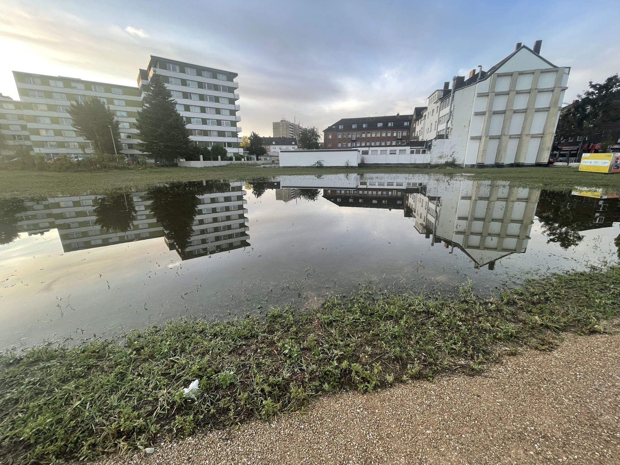 Die künstlichen Kuhlen rechts und links der provisorischen Promenade im Innovationsquartier Düren (IQD) am Bahnhofgelände haben sich nach dem Starkregen am Dienstag mit Regenwasser gefüllt.